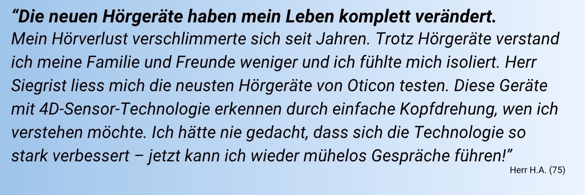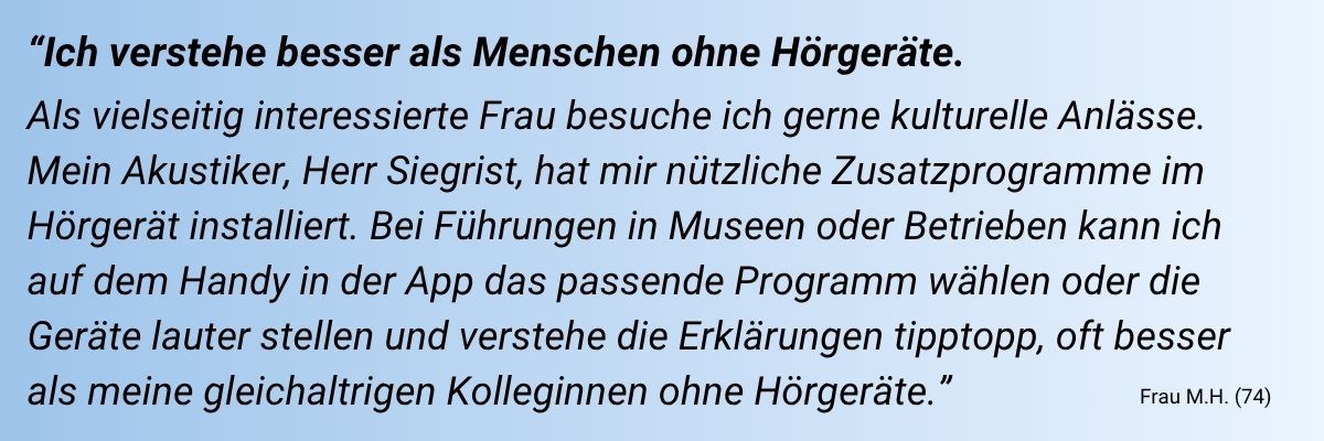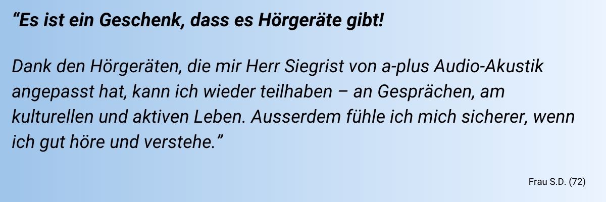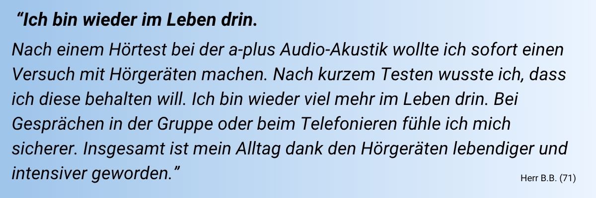 Wir beraten und informieren unsere Kunden nach einem Hörtest, ob und wie Hörgeräte die Lebensqualität steigern können, damit sie wieder besser hören und verstehen und sich im Alltag sicher fühlen.